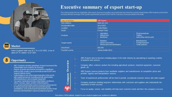 This slide provides the key highlights of the export business including a quick pitch that describes the current market status of the industry and how the company will take leverage of the growth opportunities present in the market. It will also showcase details of its entity. If your project calls for a presentation, then Slidegeeks is your go-to partner because we have professionally designed, easy-to-edit templates that are perfect for any presentation. After downloading, you can easily edit Executive Summary Of Export Start Up Export Business Plan Formats Pdf and make the changes accordingly. You can rearrange slides or fill them with different images. Check out all the handy templates This slide provides the key highlights of the export business including a quick pitch that describes the current market status of the industry and how the company will take leverage of the growth opportunities present in the market. It will also showcase details of its entity.