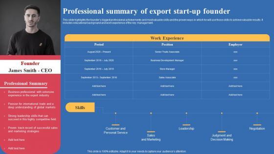 This slide highlights the founders biggest professional achievements and most valuable skills and the proven ways in which he will use those skills to achieve valuable results. It includes educational background and work experience of the key management. Here you can discover an assortment of the finest PowerPoint and Google Slides templates. With these templates, you can create presentations for a variety of purposes while simultaneously providing your audience with an eye-catching visual experience. Download Professional Summary Of Export Start Up Founder Export Business Plan Slides Pdf to deliver an impeccable presentation. These templates will make your job of preparing presentations much quicker, yet still, maintain a high level of quality. Slidegeeks has experienced researchers who prepare these templates and write high-quality content for you. Later on, you can personalize the content by editing the Professional Summary Of Export Start Up Founder Export Business Plan Slides Pdf This slide highlights the founders biggest professional achievements and most valuable skills and the proven ways in which he will use those skills to achieve valuable results. It includes educational background and work experience of the key management.