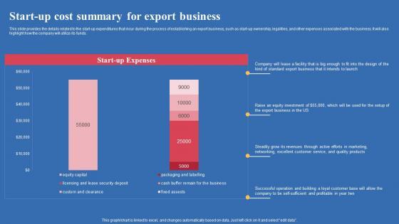 This slide provides the details related to the start-up expenditures that incur during the process of establishing an export business, such as start-up ownership, legalities, and other expenses associated with the business. It will also highlight how the company will utilize its funds. Boost your pitch with our creative Start Up Cost Summary For Export Business Export Business Plan Designs Pdf Deliver an awe-inspiring pitch that will mesmerize everyone. Using these presentation templates you will surely catch everyones attention. You can browse the ppts collection on our website. We have researchers who are experts at creating the right content for the templates. So you do not have to invest time in any additional work. Just grab the template now and use them. This slide provides the details related to the start-up expenditures that incur during the process of establishing an export business, such as start-up ownership, legalities, and other expenses associated with the business. It will also highlight how the company will utilize its funds.