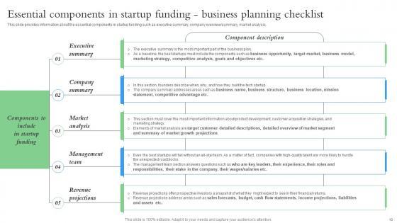 This slide provides information about the essential components in startup funding such as executive summary, company overview summary, market analysis, From laying roadmaps to briefing everything in detail, our templates are perfect for you. You can set the stage with your presentation slides. All you have to do is download these easy-to-edit and customizable templates. Essential Components In Startup Funding Startup Investment Sources Designs Pdf will help you deliver an outstanding performance that everyone would remember and praise you for. Do download this presentation today. This slide provides information about the essential components in startup funding such as executive summary, company overview summary, market analysis