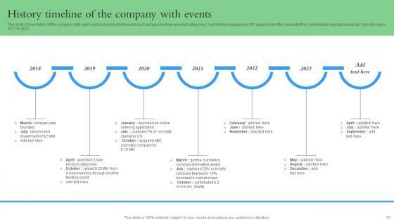 This slide shows history of the company with years and some important events such as launched new product categories, market share acquired in US, acquired another cosmetic firm, contribution towards society etc. from the years 2017 to 2021. Do you have an important presentation coming up Are you looking for something that will make your presentation stand out from the rest Look no further than History Timeline Of The Company With Events Startup Investment Sources Topics Pdf. With our professional designs, you can trust that your presentation will pop and make delivering it a smooth process. And with Slidegeeks, you can trust that your presentation will be unique and memorable. So why wait Grab History Timeline Of The Company With Events Startup Investment Sources Topics Pdf today and make your presentation stand out from the rest This slide shows history of the company with years and some important events such as launched new product categories, market share acquired in US, acquired another cosmetic firm, contribution towards society etc. from the years 2017 to 2021.