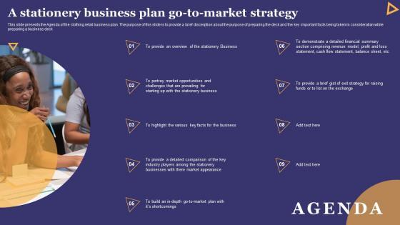 Find a pre designed and impeccable Agenda A Stationery Business Plan Go To Market Strategy Diagrams Pdf. The templates can ace your presentation without additional effort. You can download these easy to edit presentation templates to make your presentation stand out from others. So, what are you waiting for Download the template from Slidegeeks today and give a unique touch to your presentation. Our Agenda A Stationery Business Plan Go To Market Strategy Diagrams Pdf are topically designed to provide an attractive backdrop to any subject. Use them to look like a presentation pro.