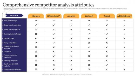 The purpose of this slide is to provide a glimpse of key competitors in the industry to gain insight into their product, services, sales, and marketing tactic. It will help the start up implement new business strategies to compete successfully in the market. There are so many reasons you need a Comprehensive Competitor Analysis Stationery Business Plan Go To Market Strategy Inspiration Pdf. The first reason is you can not spend time making everything from scratch, Thus, Slidegeeks has made presentation templates for you too. You can easily download these templates from our website easily. The purpose of this slide is to provide a glimpse of key competitors in the industry to gain insight into their product, services, sales, and marketing tactic. It will help the start up implement new business strategies to compete successfully in the market.