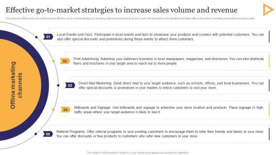 The purpose of this slide is to implement an effective go to market strategy for bringing stationery business to an end customer taking into consideration elements offline and online marketing channels to increase sales. Slidegeeks is here to make your presentations a breeze with Effective Go To Market Strategies To Increase Stationery Business Plan Go To Market Strategy Mockup Pdf With our easy to use and customizable templates, you can focus on delivering your ideas rather than worrying about formatting. With a variety of designs to choose from, you are sure to find one that suits your needs. And with animations and unique photos, illustrations, and fonts, you can make your presentation pop. So whether you are giving a sales pitch or presenting to the board, make sure to check out Slidegeeks first The purpose of this slide is to implement an effective go to market strategy for bringing stationery business to an end customer taking into consideration elements offline and online marketing channels to increase sales.