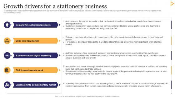 This slide provides a detailed information about the market opportunity which demand for customized products, entry into a new market, e commerce and digital marketing, shift towards remote work and expansion into complementary market. Crafting an eye catching presentation has never been more straightforward. Let your presentation shine with this tasteful yet straightforward Growth Drivers For A Stationery Business Stationery Business Plan Go To Market Strategy Themes Pdf template. It offers a minimalistic and classy look that is great for making a statement. The colors have been employed intelligently to add a bit of playfulness while still remaining professional. Construct the ideal Growth Drivers For A Stationery Business Stationery Business Plan Go To Market Strategy Themes Pdf that effortlessly grabs the attention of your audience Begin now and be certain to wow your customers This slide provides a detailed information about the market opportunity which demand for customized products, entry into a new market, e commerce and digital marketing, shift towards remote work and expansion into complementary market.