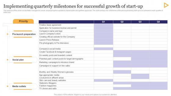 The purpose of this slide is to facilitate managers to convey project progress updates to stakeholders and get their approvals. The slide portrays key milestones of the personal training start up to be achieved in each quarter of initial year. qMake sure to capture your audiences attention in your business displays with our gratis customizable Implementing Quarterly Milestones Successful Stationery Business Plan Go To Market Strategy Inspiration Pdf. These are great for business strategies, office conferences, capital raising or task suggestions. If you desire to acquire more customers for your tech business and ensure they stay satisfied, create your own sales presentation with these plain slides. The purpose of this slide is to facilitate managers to convey project progress updates to stakeholders and get their approvals. The slide portrays key milestones of the personal training start up to be achieved in each quarter of initial year.