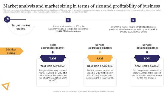 This slide provides a brief gist of customer analysis of the clothing store business. This slide covers a brief about the business target market, which area and what geographical segment the company will be acquiring and market sizing compared to TAM, Sam and SOM i.e. how much serviceable market can be obtained by the company till year 2027. This modern and well arranged Market Analysis And Market Sizing Terms Stationery Business Plan Go To Market Strategy Themes Pdf provides lots of creative possibilities. It is very simple to customize and edit with the Powerpoint Software. Just drag and drop your pictures into the shapes. All facets of this template can be edited with Powerpoint, no extra software is necessary. Add your own material, put your images in the places assigned for them, adjust the colors, and then you can show your slides to the world, with an animated slide included. This slide provides a brief gist of customer analysis of the clothing store business. This slide covers a brief about the business target market, which area and what geographical segment the company will be acquiring and market sizing compared to TAM, Sam and SOM i.e. how much serviceable market can be obtained by the company till year 2027.