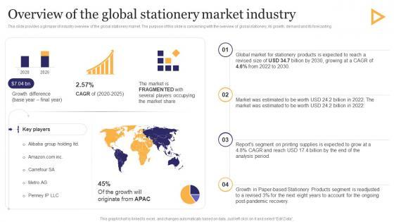 This slide provides a glimpse of industry overview of the global stationery market. The purpose of this slide is concerning with the overview of global stationery, its growth, demand and its forecasting. Explore a selection of the finest Overview Of The Global Stationery Market Industry Stationery Business Plan Go To Market Strategy Sample Pdf here. With a plethora of professionally designed and pre made slide templates, you can quickly and easily find the right one for your upcoming presentation. You can use our Overview Of The Global Stationery Market Industry Stationery Business Plan Go To Market Strategy Sample Pdf to effectively convey your message to a wider audience. Slidegeeks has done a lot of research before preparing these presentation templates. The content can be personalized and the slides are highly editable. Grab templates today from Slidegeeks. This slide provides a glimpse of industry overview of the global stationery market. The purpose of this slide is concerning with the overview of global stationery, its growth, demand and its forecasting.