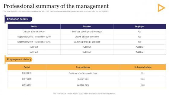 The slide highlights the professional summary section of the cafe. It will include educational background and work experience of the key management. The Professional Summary Of The Management Stationery Business Plan Go To Market Strategy Pictures Pdf is a compilation of the most recent design trends as a series of slides. It is suitable for any subject or industry presentation, containing attractive visuals and photo spots for businesses to clearly express their messages. This template contains a variety of slides for the user to input data, such as structures to contrast two elements, bullet points, and slides for written information. Slidegeeks is prepared to create an impression. The slide highlights the professional summary section of the cafe. It will include educational background and work experience of the key management.