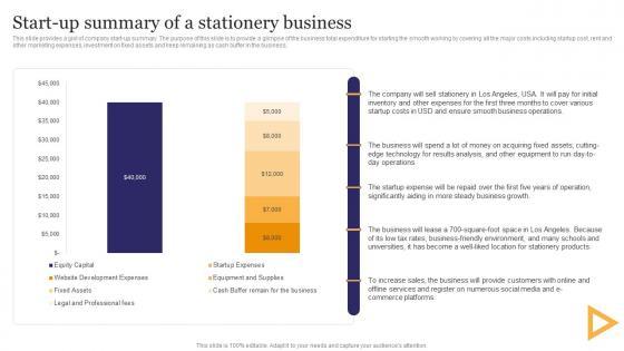 This slide provides a gist of company start up summary. The purpose of this slide is to provide a glimpse of the business total expenditure for starting the smooth working by covering all the major costs including startup cost, rent and other marketing expenses, investment on fixed assets and keep remaining as cash buffer in the business. Presenting this PowerPoint presentation, titled Start Up Summary Of A Stationery Business Stationery Business Plan Go To Market Strategy Portrait Pdf, with topics curated by our researchers after extensive research. This editable presentation is available for immediate download and provides attractive features when used. Download now and captivate your audience. Presenting this Start Up Summary Of A Stationery Business Stationery Business Plan Go To Market Strategy Portrait Pdf. Our researchers have carefully researched and created these slides with all aspects taken into consideration. This is a completely customizable Start Up Summary Of A Stationery Business Stationery Business Plan Go To Market Strategy Portrait Pdf that is available for immediate downloading. Download now and make an impact on your audience. Highlight the attractive features available with our PPTs. This slide provides a gist of company start up summary. The purpose of this slide is to provide a glimpse of the business total expenditure for starting the smooth working by covering all the major costs including startup cost, rent and other marketing expenses, investment on fixed assets and keep remaining as cash buffer in the business.