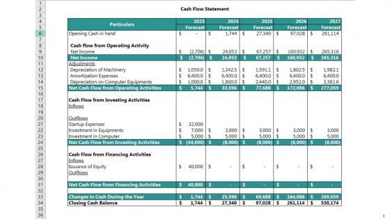 This slide represents the businesss historical and forecasted cash flow results and the amount of cash the business will introduce to starts its operations. The slide is presented to know the business cash performance, weather the business is heaving a positive cash balance and meeting all the obligations or not. Slidegeeks is one of the best resources for PowerPoint templates. You can download easily and regulate Cash Flow Statement A Detailed Stationery Business Plan Go To Market Strategy Brochure Pdf for your personal presentations from our wonderful collection. A few clicks is all it takes to discover and get the most relevant and appropriate templates. Use our Templates to add a unique zing and appeal to your presentation and meetings. All the slides are easy to edit and you can use them even for advertisement purposes. This slide represents the businesss historical and forecasted cash flow results and the amount of cash the business will introduce to starts its operations. The slide is presented to know the business cash performance, weather the business is heaving a positive cash balance and meeting all the obligations or not.