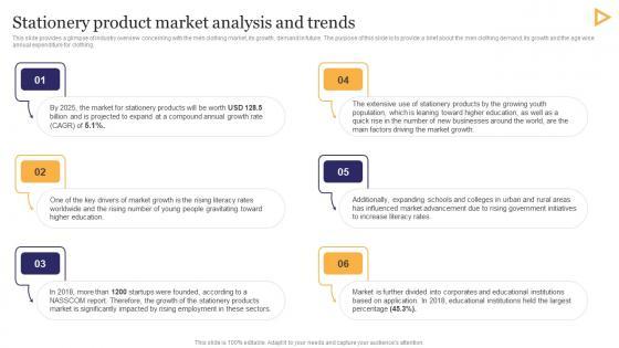 This slide provides a glimpse of industry overview concerning with the men clothing market, its growth, demand in future. The purpose of this slide is to provide a brief about the men clothing demand, its growth and the age wise annual expenditure for clothing. Find a pre designed and impeccable Stationery Product Market Analysis And Trends Stationery Business Plan Go To Market Strategy Guidelines Pdf. The templates can ace your presentation without additional effort. You can download these easy to edit presentation templates to make your presentation stand out from others. So, what are you waiting for Download the template from Slidegeeks today and give a unique touch to your presentation. This slide provides a glimpse of industry overview concerning with the men clothing market, its growth, demand in future. The purpose of this slide is to provide a brief about the men clothing demand, its growth and the age wise annual expenditure for clothing.