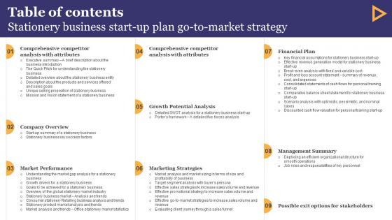 Boost your pitch with our creative Table Of Contents Stationery Business Start Up Plan Go To Market Strategy Icons Pdf. Deliver an awe inspiring pitch that will mesmerize everyone. Using these presentation templates you will surely catch everyones attention. You can browse the ppts collection on our website. We have researchers who are experts at creating the right content for the templates. So you do not have to invest time in any additional work. Just grab the template now and use them. Our Table Of Contents Stationery Business Start Up Plan Go To Market Strategy Icons Pdf are topically designed to provide an attractive backdrop to any subject. Use them to look like a presentation pro.