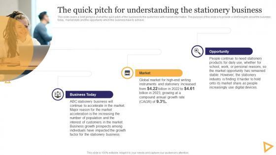 This slide covers a brief glimpse of what the quick pitch of the business to the customers with market information. The purpose of this slide is to provide a brief insights about the business today, market stats and the opportunity which the business have to achieve. Slidegeeks is one of the best resources for PowerPoint templates. You can download easily and regulate The Quick Pitch For Understanding Stationery Business Plan Go To Market Strategy Icons Pdf for your personal presentations from our wonderful collection. A few clicks is all it takes to discover and get the most relevant and appropriate templates. Use our Templates to add a unique zing and appeal to your presentation and meetings. All the slides are easy to edit and you can use them even for advertisement purposes. This slide covers a brief glimpse of what the quick pitch of the business to the customers with market information. The purpose of this slide is to provide a brief insights about the business today, market stats and the opportunity which the business have to achieve.