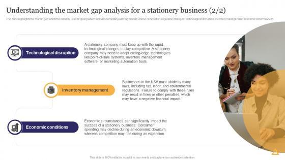 This slide highlights the market gap which the industry is undergoing which includes competing with big brands, online competition, regulatory changes, technological disruption, inventory management, economic circumstances. Want to ace your presentation in front of a live audience Our Understanding The Market Gap Analysis Stationery Business Plan Go To Market Strategy Download Pdf can help you do that by engaging all the users towards you. Slidegeeks experts have put their efforts and expertise into creating these impeccable powerpoint presentations so that you can communicate your ideas clearly. Moreover, all the templates are customizable, and easy to edit and downloadable. Use these for both personal and commercial use. This slide highlights the market gap which the industry is undergoing which includes competing with big brands, online competition, regulatory changes, technological disruption, inventory management, economic circumstances.