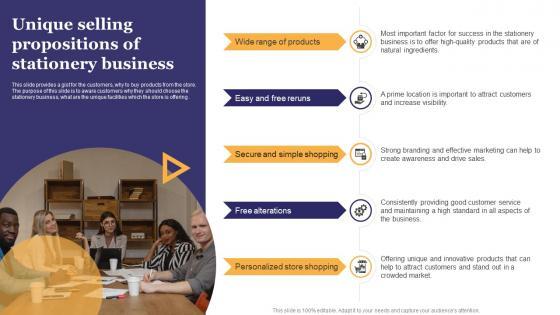 This slide provides a gist for the customers, why to buy products from the store. The purpose of this slide is to aware customers why they should choose the stationery business, what are the unique facilities which the store is offering . There are so many reasons you need a Unique Selling Propositions Stationery Business Plan Go To Market Strategy Diagrams Pdf. The first reason is you can not spend time making everything from scratch, Thus, Slidegeeks has made presentation templates for you too. You can easily download these templates from our website easily. This slide provides a gist for the customers, why to buy products from the store. The purpose of this slide is to aware customers why they should choose the stationery business, what are the unique facilities which the store is offering .