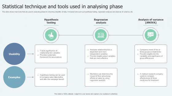 This slide shows main tools that are used in analysing phase for checking reliability of data. It include tools such as hypothesis testing, regression analysis and analysis of variance, etc. Are you in need of a template that can accommodate all of your creative concepts This one is crafted professionally and can be altered to fit any style. Use it with Google Slides or PowerPoint. Include striking photographs, symbols, depictions, and other visuals. Fill, move around, or remove text boxes as desired. Test out color palettes and font mixtures. Edit and save your work, or work with colleagues. Download Statistical Technique And Tools Lean Six Sigma In Manufacturing Ppt Template and observe how to make your presentation outstanding. Give an impeccable presentation to your group and make your presentation unforgettable. This slide shows main tools that are used in analysing phase for checking reliability of data. It include tools such as hypothesis testing, regression analysis and analysis of variance, etc.