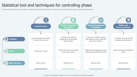 This slide shows major tools that are used for controlling phase of DMAIC technology. It include tools such as control charts, change management techniques, etc. Crafting an eye-catching presentation has never been more straightforward. Let your presentation shine with this tasteful yet straightforward Statistical Tool And Techniques Lean Six Sigma In Manufacturing Ppt Slide template. It offers a minimalistic and classy look that is great for making a statement. The colors have been employed intelligently to add a bit of playfulness while still remaining professional. Construct the ideal Statistical Tool And Techniques Lean Six Sigma In Manufacturing Ppt Slide that effortlessly grabs the attention of your audience Begin now and be certain to wow your customers This slide shows major tools that are used for controlling phase of DMAIC technology. It include tools such as control charts, change management techniques, etc.