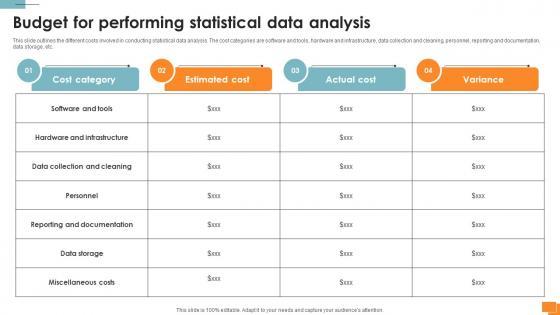 This slide outlines the different costs involved in conducting statistical data analysis. The cost categories are software and tools, hardware and infrastructure, data collection and cleaning, personnel, reporting and documentation, data storage, etc. Slidegeeks is here to make your presentations a breeze with Statistical Tools For Evidence Budget For Performing Statistical Data Analysis With our easy-to-use and customizable templates, you can focus on delivering your ideas rather than worrying about formatting. With a variety of designs to choose from, you are sure to find one that suits your needs. And with animations and unique photos, illustrations, and fonts, you can make your presentation pop. So whether you are giving a sales pitch or presenting to the board, make sure to check out Slidegeeks first This slide outlines the different costs involved in conducting statistical data analysis. The cost categories are software and tools, hardware and infrastructure, data collection and cleaning, personnel, reporting and documentation, data storage, etc.
