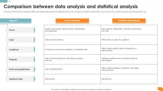 The purpose of this slide is to outline the differences between data analysis and statistical analysis. The comparison is based on several factors such as focus, tools, audience, purpose, proof and predictions, etc. Find highly impressive Statistical Tools For Evidence Comparison Between Data Analysis And Statistical Analysis on Slidegeeks to deliver a meaningful presentation. You can save an ample amount of time using these presentation templates. No need to worry to prepare everything from scratch because Slidegeeks experts have already done a huge research and work for you. You need to download Statistical Tools For Evidence Comparison Between Data Analysis And Statistical Analysis for your upcoming presentation. All the presentation templates are 100 percent editable and you can change the color and personalize the content accordingly. Download now The purpose of this slide is to outline the differences between data analysis and statistical analysis. The comparison is based on several factors such as focus, tools, audience, purpose, proof and predictions, etc.
