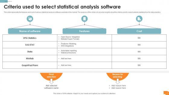 This slide represents the features and cost of various statistical analysis software available in the market. The purpose of this slide is to provide insights about the criteria used to select suitable statistical tool for data analytics. If your project calls for a presentation, then Slidegeeks is your go-to partner because we have professionally designed, easy-to-edit templates that are perfect for any presentation. After downloading, you can easily edit Statistical Tools For Evidence Criteria Used To Select Statistical Analysis Software and make the changes accordingly. You can rearrange slides or fill them with different images. Check out all the handy templates This slide represents the features and cost of various statistical analysis software available in the market. The purpose of this slide is to provide insights about the criteria used to select suitable statistical tool for data analytics.