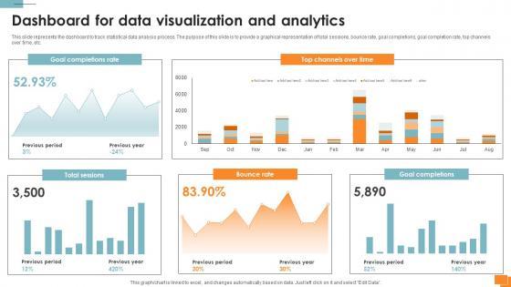 This slide represents the dashboard to track statistical data analysis process. The purpose of this slide is to provide a graphical representation of total sessions, bounce rate, goal completions, goal completion rate, top channels over time, etc. Are you in need of a template that can accommodate all of your creative concepts This one is crafted professionally and can be altered to fit any style. Use it with Google Slides or PowerPoint. Include striking photographs, symbols, depictions, and other visuals. Fill, move around, or remove text boxes as desired. Test out color palettes and font mixtures. Edit and save your work, or work with colleagues. Download Statistical Tools For Evidence Dashboard For Data Visualization And Analytics and observe how to make your presentation outstanding. Give an impeccable presentation to your group and make your presentation unforgettable. This slide represents the dashboard to track statistical data analysis process. The purpose of this slide is to provide a graphical representation of total sessions, bounce rate, goal completions, goal completion rate, top channels over time, etc.