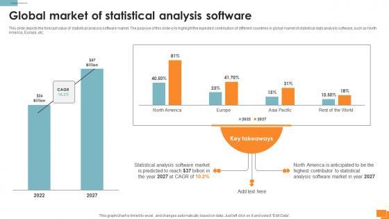 This slide depicts the forecast value of statistical analysis software market. The purpose of this slide is to highlight the expected contribution of different countries in global market of statistical data analysis software, such as North America, Europe, etc. This modern and well-arranged Statistical Tools For Evidence Global Market Of Statistical Analysis Software provides lots of creative possibilities. It is very simple to customize and edit with the Powerpoint Software. Just drag and drop your pictures into the shapes. All facets of this template can be edited with Powerpoint, no extra software is necessary. Add your own material, put your images in the places assigned for them, adjust the colors, and then you can show your slides to the world, with an animated slide included. This slide depicts the forecast value of statistical analysis software market. The purpose of this slide is to highlight the expected contribution of different countries in global market of statistical data analysis software, such as North America, Europe, etc.