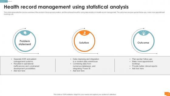 This slide represents the concise overview of the problem, the proposed solution, and the achieved result for using data analytics in health record management. The outcomes are plan quicker follow-ups, make more appointment bookings, etc. This Statistical Tools For Evidence Health Record Management Using Statistical Analysis is perfect for any presentation, be it in front of clients or colleagues. It is a versatile and stylish solution for organizing your meetings. The Statistical Tools For Evidence Health Record Management Using Statistical Analysis features a modern design for your presentation meetings. The adjustable and customizable slides provide unlimited possibilities for acing up your presentation. Slidegeeks has done all the homework before launching the product for you. So, do not wait, grab the presentation templates today This slide represents the concise overview of the problem, the proposed solution, and the achieved result for using data analytics in health record management. The outcomes are plan quicker follow-ups, make more appointment bookings, etc.