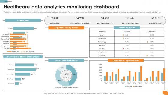 This slide represents the dashboard to monitor the data analytics in healthcare department. The key components of this slide are overall patient satisfaction, patients by division, average waiting time, total patients admitted, etc. Welcome to our selection of the Statistical Tools For Evidence Healthcare Data Analytics Monitoring Dashboard. These are designed to help you showcase your creativity and bring your sphere to life. Planning and Innovation are essential for any business that is just starting out. This collection contains the designs that you need for your everyday presentations. All of our PowerPoints are 100Percent editable, so you can customize them to suit your needs. This multi-purpose template can be used in various situations. Grab these presentation templates today. This slide represents the dashboard to monitor the data analytics in healthcare department. The key components of this slide are overall patient satisfaction, patients by division, average waiting time, total patients admitted, etc.