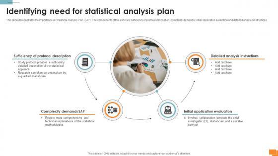 This slide demonstrates the importance of Statistical Analysis Plan SAP. The components of this slide are sufficiency of protocol description, complexity demands, initial application evaluation and detailed analysis instructions. Explore a selection of the finest Statistical Tools For Evidence Identifying Need For Statistical Analysis Plan here. With a plethora of professionally designed and pre-made slide templates, you can quickly and easily find the right one for your upcoming presentation. You can use our Statistical Tools For Evidence Identifying Need For Statistical Analysis Plan to effectively convey your message to a wider audience. Slidegeeks has done a lot of research before preparing these presentation templates. The content can be personalized and the slides are highly editable. Grab templates today from Slidegeeks. This slide demonstrates the importance of Statistical Analysis Plan SAP. The components of this slide are sufficiency of protocol description, complexity demands, initial application evaluation and detailed analysis instructions.