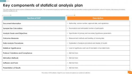 This slide outlines the various sections of Statistical Analysis Plan SAP. The components include document information, sample size calculation, analysis goals and objectives, outcome measures, data analysis procedures, statistical significance, etc. The Statistical Tools For Evidence Key Components Of Statistical Analysis Plan is a compilation of the most recent design trends as a series of slides. It is suitable for any subject or industry presentation, containing attractive visuals and photo spots for businesses to clearly express their messages. This template contains a variety of slides for the user to input data, such as structures to contrast two elements, bullet points, and slides for written information. Slidegeeks is prepared to create an impression. This slide outlines the various sections of Statistical Analysis Plan SAP. The components include document information, sample size calculation, analysis goals and objectives, outcome measures, data analysis procedures, statistical significance, etc.