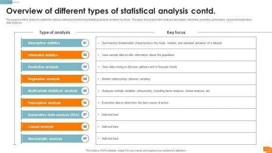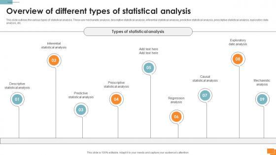 This slide outlines the various types of statistical analysis. These are mechanistic analysis, descriptive statistical analysis, inferential statistical analysis, predictive statistical analysis, prescriptive statistical analysis, exploratory data analysis, etc. Presenting this PowerPoint presentation, titled Statistical Tools For Evidence Overview Of Different Types Of Statistical Analysis, with topics curated by our researchers after extensive research. This editable presentation is available for immediate download and provides attractive features when used. Download now and captivate your audience. Presenting this Statistical Tools For Evidence Overview Of Different Types Of Statistical Analysis. Our researchers have carefully researched and created these slides with all aspects taken into consideration. This is a completely customizable Statistical Tools For Evidence Overview Of Different Types Of Statistical Analysis that is available for immediate downloading. Download now and make an impact on your audience. Highlight the attractive features available with our PPTs. This slide outlines the various types of statistical analysis. These are mechanistic analysis, descriptive statistical analysis, inferential statistical analysis, predictive statistical analysis, prescriptive statistical analysis, exploratory data analysis, etc.