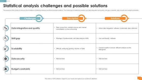 The purpose of this slide is to discuss the limitations of statistical analysis and their possible solutions. The challenges of statistical analytics are data integration and quality, skill gap, scalability, data security and budget constraints. Take your projects to the next level with our ultimate collection of Statistical Tools For Evidence Statistical Analysis Challenges And Possible Solutions. Slidegeeks has designed a range of layouts that are perfect for representing task or activity duration, keeping track of all your deadlines at a glance. Tailor these designs to your exact needs and give them a truly corporate look with your own brand colors they will make your projects stand out from the rest The purpose of this slide is to discuss the limitations of statistical analysis and their possible solutions. The challenges of statistical analytics are data integration and quality, skill gap, scalability, data security and budget constraints.