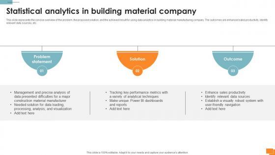 This slide represents the concise overview of the problem, the proposed solution, and the achieved result for using data analytics in building material manufacturing company. The outcomes are enhanced sales productivity, identify relevant data sources, etc. Slidegeeks is one of the best resources for PowerPoint templates. You can download easily and regulate Statistical Tools For Evidence Statistical Analytics In Building Material Company for your personal presentations from our wonderful collection. A few clicks is all it takes to discover and get the most relevant and appropriate templates. Use our Templates to add a unique zing and appeal to your presentation and meetings. All the slides are easy to edit and you can use them even for advertisement purposes. This slide represents the concise overview of the problem, the proposed solution, and the achieved result for using data analytics in building material manufacturing company. The outcomes are enhanced sales productivity, identify relevant data sources, etc.