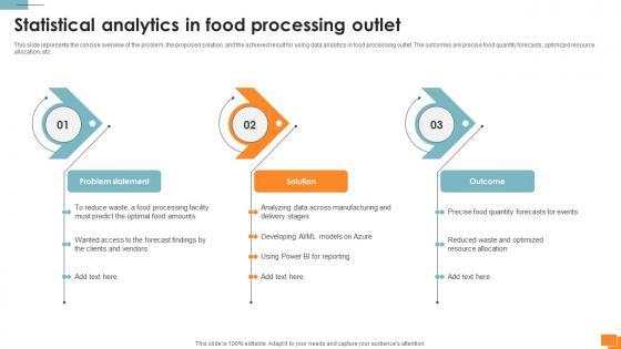 This slide represents the concise overview of the problem, the proposed solution, and the achieved result for using data analytics in food processing outlet. The outcomes are precise food quantity forecasts, optimized resource allocation, etc. Want to ace your presentation in front of a live audience Our Statistical Tools For Evidence Statistical Analytics In Food Processing Outlet can help you do that by engaging all the users towards you. Slidegeeks experts have put their efforts and expertise into creating these impeccable powerpoint presentations so that you can communicate your ideas clearly. Moreover, all the templates are customizable, and easy-to-edit and downloadable. Use these for both personal and commercial use. This slide represents the concise overview of the problem, the proposed solution, and the achieved result for using data analytics in food processing outlet. The outcomes are precise food quantity forecasts, optimized resource allocation, etc.