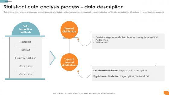 This slide discusses the data description phase of statistical analysis, which includes methods such as scatter plot, bar chart, frequency distribution, etc. This slide also outlines the different types of skewed distribution techniques. Do you have to make sure that everyone on your team knows about any specific topic I yes, then you should give Statistical Tools For Evidence Statistical Data Analysis Process Data Description a try. Our experts have put a lot of knowledge and effort into creating this impeccable Statistical Tools For Evidence Statistical Data Analysis Process Data Description. You can use this template for your upcoming presentations, as the slides are perfect to represent even the tiniest detail. You can download these templates from the Slidegeeks website and these are easy to edit. So grab these today This slide discusses the data description phase of statistical analysis, which includes methods such as scatter plot, bar chart, frequency distribution, etc. This slide also outlines the different types of skewed distribution techniques.