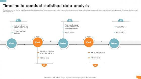 This slide shows the timeline for performing statistical data analysis. The key steps include writing hypothesis and plan research design, collect data from a sample, summarize data with descriptive statistics, test hypotheses, result interpretation, etc. From laying roadmaps to briefing everything in detail, our templates are perfect for you. You can set the stage with your presentation slides. All you have to do is download these easy-to-edit and customizable templates. Statistical Tools For Evidence Timeline To Conduct Statistical Data Analysis will help you deliver an outstanding performance that everyone would remember and praise you for. Do download this presentation today. This slide shows the timeline for performing statistical data analysis. The key steps include writing hypothesis and plan research design, collect data from a sample, summarize data with descriptive statistics, test hypotheses, result interpretation, etc.