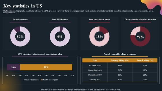 The following slide highlights the key statistics of DisneyPlus in USA to provide an overview of Disney streaming services. It depicts exclusive content ratio, total SVOD share, total subscription share, subscriber retention rate and billing preference. Crafting an eye-catching presentation has never been more straightforward. Let your presentation shine with this tasteful yet straightforward Key Statistics In Us OTT Platform Company Outline Brochure Pdf template. It offers a minimalistic and classy look that is great for making a statement. The colors have been employed intelligently to add a bit of playfulness while still remaining professional. Construct the ideal Key Statistics In Us OTT Platform Company Outline Brochure Pdf that effortlessly grabs the attention of your audience Begin now and be certain to wow your customers The following slide highlights the key statistics of DisneyPlus in USA to provide an overview of Disney streaming services. It depicts exclusive content ratio, total SVOD share, total subscription share, subscriber retention rate and billing preference