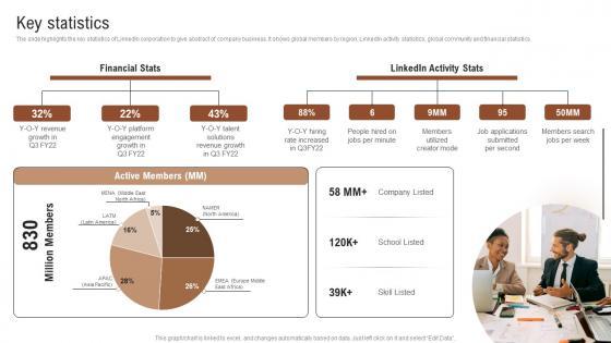 The slide highlights the key statistics of LinkedIn corporation to give abstract of company business. It shows global members by region, LinkedIn activity statistics, global community and financial statistics.Deliver an awe inspiring pitch with this creative Linkedin Company Outline Key Statistics Summary PDF bundle. Topics like Revenue Growth, Platform Engagement Growth, Solutions Revenue can be discussed with this completely editable template. It is available for immediate download depending on the needs and requirements of the user.