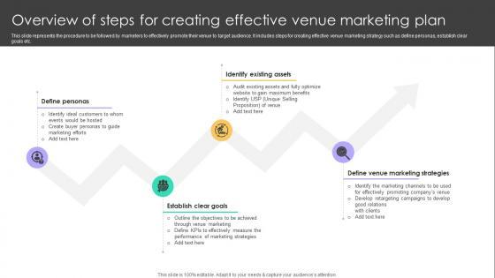 This slide represents the procedure to be followed by marketers to effectively promote their venue to target audience. It includes steps for creating effective venue marketing strategy such as define personas, establish clear goals etc. If you are looking for a format to display your unique thoughts, then the professionally designed Online Venue Advertising Plan Overview Of Steps For Creating Effective Venue Marketing Plan Strategy SS V is the one for you. You can use it as a Google Slides template or a PowerPoint template. Incorporate impressive visuals, symbols, images, and other charts. Modify or reorganize the text boxes as you desire. Experiment with shade schemes and font pairings. Alter, share or cooperate with other people on your work. Download Online Venue Advertising Plan Overview Of Steps For Creating Effective Venue Marketing Plan Strategy SS V and find out how to give a successful presentation. Present a perfect display to your team and make your presentation unforgettable. This slide represents the procedure to be followed by marketers to effectively promote their venue to target audience. It includes steps for creating effective venue marketing strategy such as define personas, establish clear goals etc.