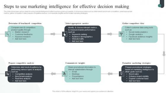 This slide showcases various steps for using market intelligence to attain business goals successfully. It showcases steps such as determine and benchmark competition, select appropriate metrics, gather competitors data, prepare competitive analysis, communicate insights and formulate marketing strategies. Retrieve professionally designed Competitive Intelligence Guide To Determine Market Steps To Use Marketing Intelligence Structure Pdf to effectively convey your message and captivate your listeners. Save time by selecting pre-made slideshows that are appropriate for various topics, from business to educational purposes. These themes come in many different styles, from creative to corporate, and all of them are easily adjustable and can be edited quickly. Access them as PowerPoint templates or as Google Slides themes. You do not have to go on a hunt for the perfect presentation because Slidegeeks got you covered from everywhere. This slide showcases various steps for using market intelligence to attain business goals successfully. It showcases steps such as determine and benchmark competition, select appropriate metrics, gather competitors data, prepare competitive analysis, communicate insights and formulate marketing strategies.