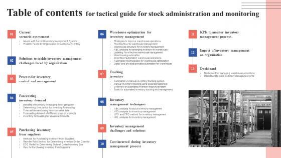 Do you know about Slidesgeeks Table Of Contents For Tactical Guide For Stock Administration And Monitoring Ideas Pdf These are perfect for delivering any kind od presentation. Using it, create PowerPoint presentations that communicate your ideas and engage audiences. Save time and effort by using our pre-designed presentation templates that are perfect for a wide range of topic. Our vast selection of designs covers a range of styles, from creative to business, and are all highly customizable and easy to edit. Download as a PowerPoint template or use them as Google Slides themes. Our Table Of Contents For Tactical Guide For Stock Administration And Monitoring Ideas Pdf are topically designed to provide an attractive backdrop to any subject. Use them to look like a presentation pro.