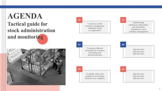 Boost your pitch with our creative Agenda Tactical Guide For Stock Administration And Monitoring Infographics Pdf. Deliver an awe-inspiring pitch that will mesmerize everyone. Using these presentation templates you will surely catch everyones attention. You can browse the ppts collection on our website. We have researchers who are experts at creating the right content for the templates. So you do not have to invest time in any additional work. Just grab the template now and use them. Our Agenda Tactical Guide For Stock Administration And Monitoring Infographics Pdf are topically designed to provide an attractive backdrop to any subject. Use them to look like a presentation pro.