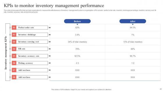 This slide showcases KPIs that can help organization to measure the effectiveness of inventory management system in organization. KPIs include - perfect order rate, inventory shrinkage percentage, inventory carrying cost, fill rate, inventory accuracy rate and picking accuracy. This modern and well-arranged Kpis To Monitor Inventory Management Performance Tactical Guide Stock Administration Guidelines Pdf provides lots of creative possibilities. It is very simple to customize and edit with the Powerpoint Software. Just drag and drop your pictures into the shapes. All facets of this template can be edited with Powerpoint, no extra software is necessary. Add your own material, put your images in the places assigned for them, adjust the colors, and then you can show your slides to the world, with an animated slide included. This slide showcases KPIs that can help organization to measure the effectiveness of inventory management system in organization. KPIs include - perfect order rate, inventory shrinkage percentage, inventory carrying cost, fill rate, inventory accuracy rate and picking accuracy.