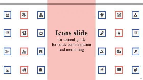 Presenting our innovatively structured Icons Slide For Tactical Guide For Stock Administration And Monitoring Information Pdf set of slides. The slides contain a hundred percent editable icons. You can replace these icons without any inconvenience. Therefore, pick this set of slides and create a striking presentation. Our Icons Slide For Tactical Guide For Stock Administration And Monitoring Information Pdf are topically designed to provide an attractive backdrop to any subject. Use them to look like a presentation pro.