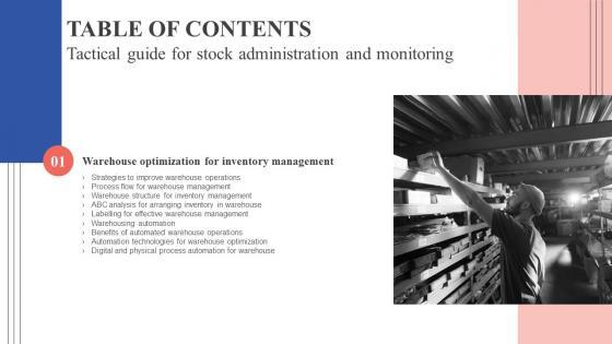 Find a pre-designed and impeccable Tactical Guide For Stock Administration And Monitoring Table Of Contents Microsoft Pdf. The templates can ace your presentation without additional effort. You can download these easy-to-edit presentation templates to make your presentation stand out from others. So, what are you waiting for Download the template from Slidegeeks today and give a unique touch to your presentation. Our Tactical Guide For Stock Administration And Monitoring Table Of Contents Microsoft Pdf are topically designed to provide an attractive backdrop to any subject. Use them to look like a presentation pro.