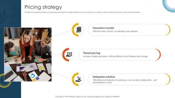 This slide showcases the company pricing strategy that helps the company determine the price of products. It includes a freemium model, tiered pricing, and an enterprise solution. Do you have an important presentation coming up Are you looking for something that will make your presentation stand out from the rest Look no further than Pricing Strategy Cloud Storage And Collaboration Service Business Model BMC SS V. With our professional designs, you can trust that your presentation will pop and make delivering it a smooth process. And with Slidegeeks, you can trust that your presentation will be unique and memorable. So why wait Grab Pricing Strategy Cloud Storage And Collaboration Service Business Model BMC SS V today and make your presentation stand out from the rest This slide showcases the company pricing strategy that helps the company determine the price of products. It includes a freemium model, tiered pricing, and an enterprise solution.
