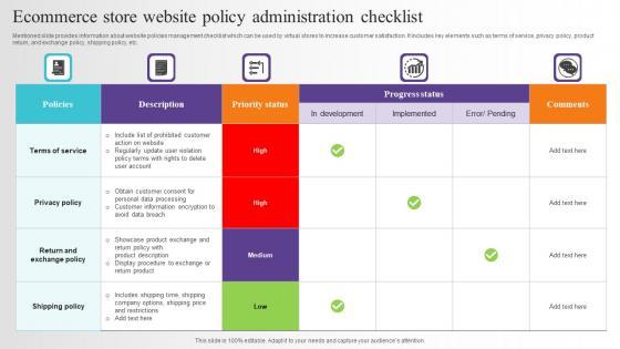 Mentioned slide provides information about website policies management checklist which can be used by virtual stores to increase customer satisfaction. It includes key elements such as terms of service, privacy policy, product return, and exchange policy, shipping policy, etc. Pitch your topic with ease and precision using this Ecommerce Store Website Policy Administration Checklist Themes Pdf. This layout presents information on Privacy Policy, Product Return, Exchange Policy. It is also available for immediate download and adjustment. So, changes can be made in the color, design, graphics or any other component to create a unique layout. Mentioned slide provides information about website policies management checklist which can be used by virtual stores to increase customer satisfaction. It includes key elements such as terms of service, privacy policy, product return, and exchange policy, shipping policy, etc.