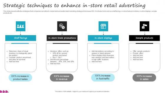 This slide presents effective strategies that companies can utilize to implement successful retail marketing strategy and increase ROI. It includes tools such as shelf facings, in-store trade promotions, in-store displays, sample products etc. Showcasing this set of slides titled Strategic Techniques To Enhance In Store Retail Advertising Inspiration Pdf. The topics addressed in these templates are Strategic Techniques, In Store Retail Advertising, Effective Strategies. All the content presented in this PPT design is completely editable. Download it and make adjustments in color, background, font etc. as per your unique business setting. This slide presents effective strategies that companies can utilize to implement successful retail marketing strategy and increase ROI. It includes tools such as shelf facings, in-store trade promotions, in-store displays, sample products etc.