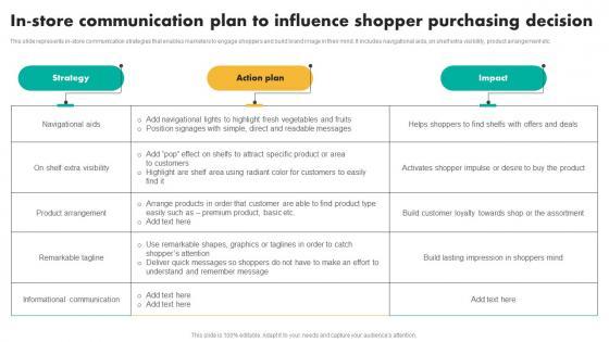 This slide represents in-store communication strategies that enables marketers to engage shoppers and build brand image in their mind. It includes navigational aids, on shelf extra visibility, product arrangement etc. Do you have an important presentation coming up Are you looking for something that will make your presentation stand out from the rest Look no further than In Store Communication Plan To Influence Shopper Optimizing Customer Purchase Experience By Executing Slides PDF. With our professional designs, you can trust that your presentation will pop and make delivering it a smooth process. And with Slidegeeks, you can trust that your presentation will be unique and memorable. So why wait Grab In Store Communication Plan To Influence Shopper Optimizing Customer Purchase Experience By Executing Slides PDF today and make your presentation stand out from the rest